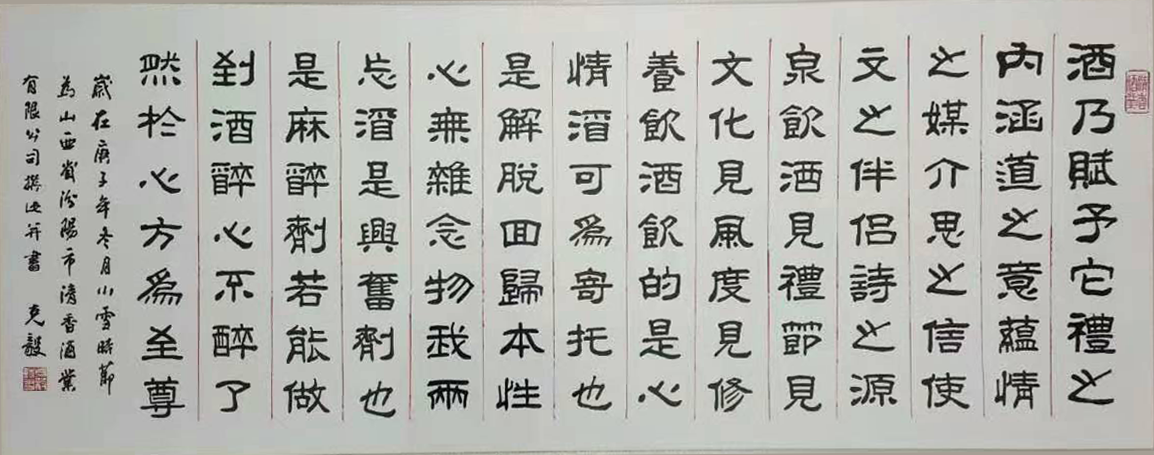 汾陽市清香酒業(yè)有限公司座落在中華名酒第一村---杏花村申明亭路9號?!斗诰魄分杏涊d,申明亭畔新淘井,水重依稀亞蟹黃 ,注解說:申明亭井水絕佳,以之釀酒,斤兩獨(dú)重。明末愛國詩人、書法家和醫(yī)學(xué)家傅山先生,曾為申明亭古井親筆題寫了得造花香四個(gè)大字,說明杏花井泉得天獨(dú)厚,釀出的美酒如同花香沁人心脾。 汾陽市清香酒業(yè)有限公司出品的清香型高端白酒用的是優(yōu)質(zhì)高粱、大麥和豌豆等上等原料和申明亭地下礦泉水,再加上杏花村土壤和空氣中獨(dú)有的菌群,在杏花村釀酒匠人的傳統(tǒng)工藝下精心釀造:清蒸二次清,固態(tài)地缸分離發(fā)酵,清字當(dāng)頭,一清到底,釀出的酒:酒液晶亮、清香幽雅、醇凈柔和、回甜爽口、飲后余香,在國內(nèi)外享有盛譽(yù)。